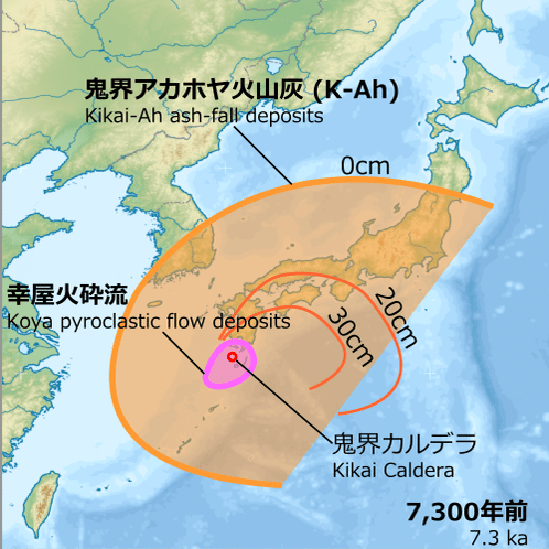 「アカホヤの大噴火」とは、「鬼界カルデラ噴火」とも呼ばれ、今から約7300年前に薩摩半島の南50㎞ほどの海底で起きた大噴火です。