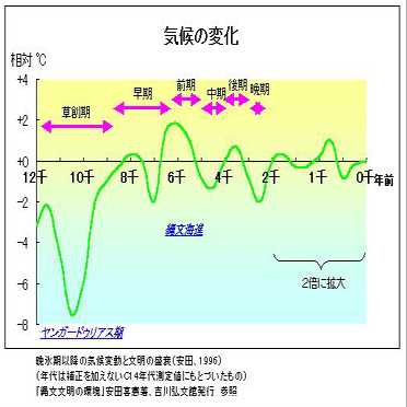 縄文時代は、一般的には16000年前±850年頃に始まるとされています。その頃の日本列島は寒冷期の終わりで温暖化が進みつつありましたが、7300年前のアカホヤ大噴火によって一時的に寒冷期を迎えます。その後、縄文中期に温暖期となり「縄文海進」といわれるように海岸線が陸地を侵食してきましたが、作物の収穫には恵まれました。ですが、今から5000年程前から再度、寒冷化が進みます。アマテルの誕生は、(千葉富三説に拠れば)今から約3300年ほど前となりますが、この再度の寒冷期は天神六代オモタル神の治世頃ではないかと考えられます。